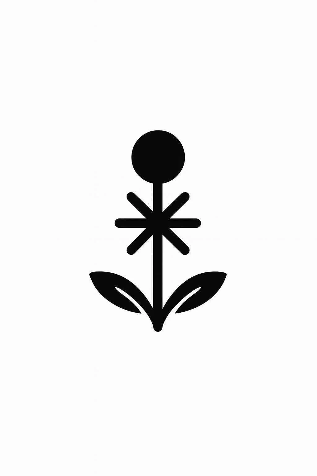 White minimalist flower symbol on black background, with a round top, petals, leaves, and stem.
